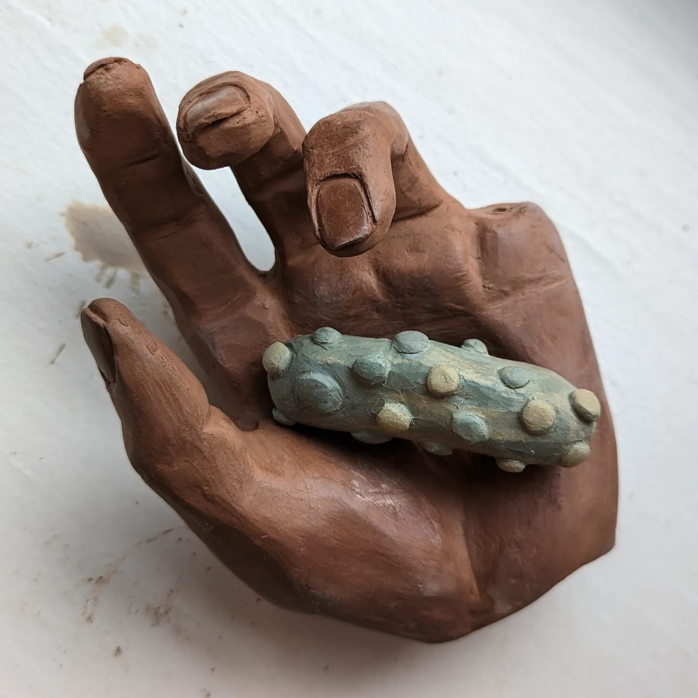 In a Pickle, 2023. Terracotta, stoneware, mason stains.